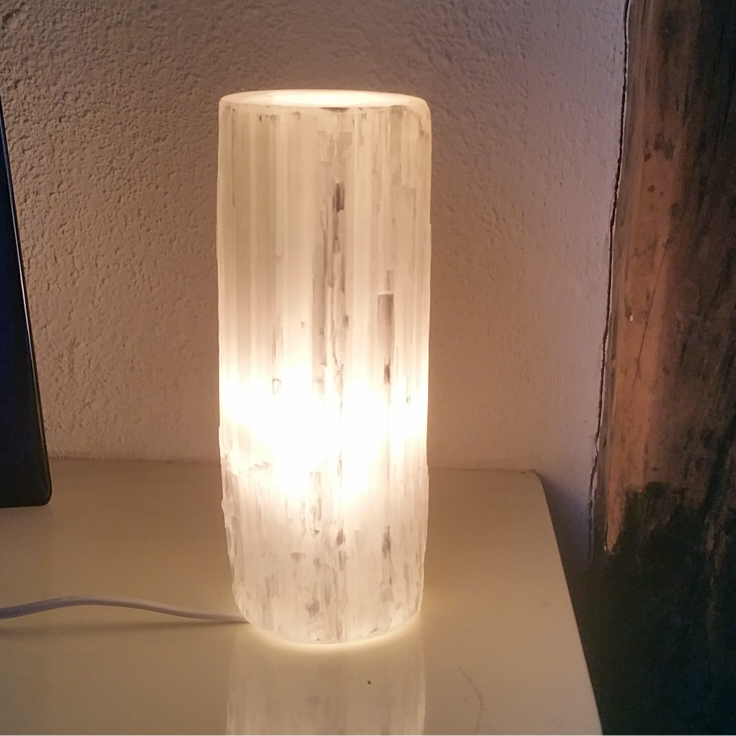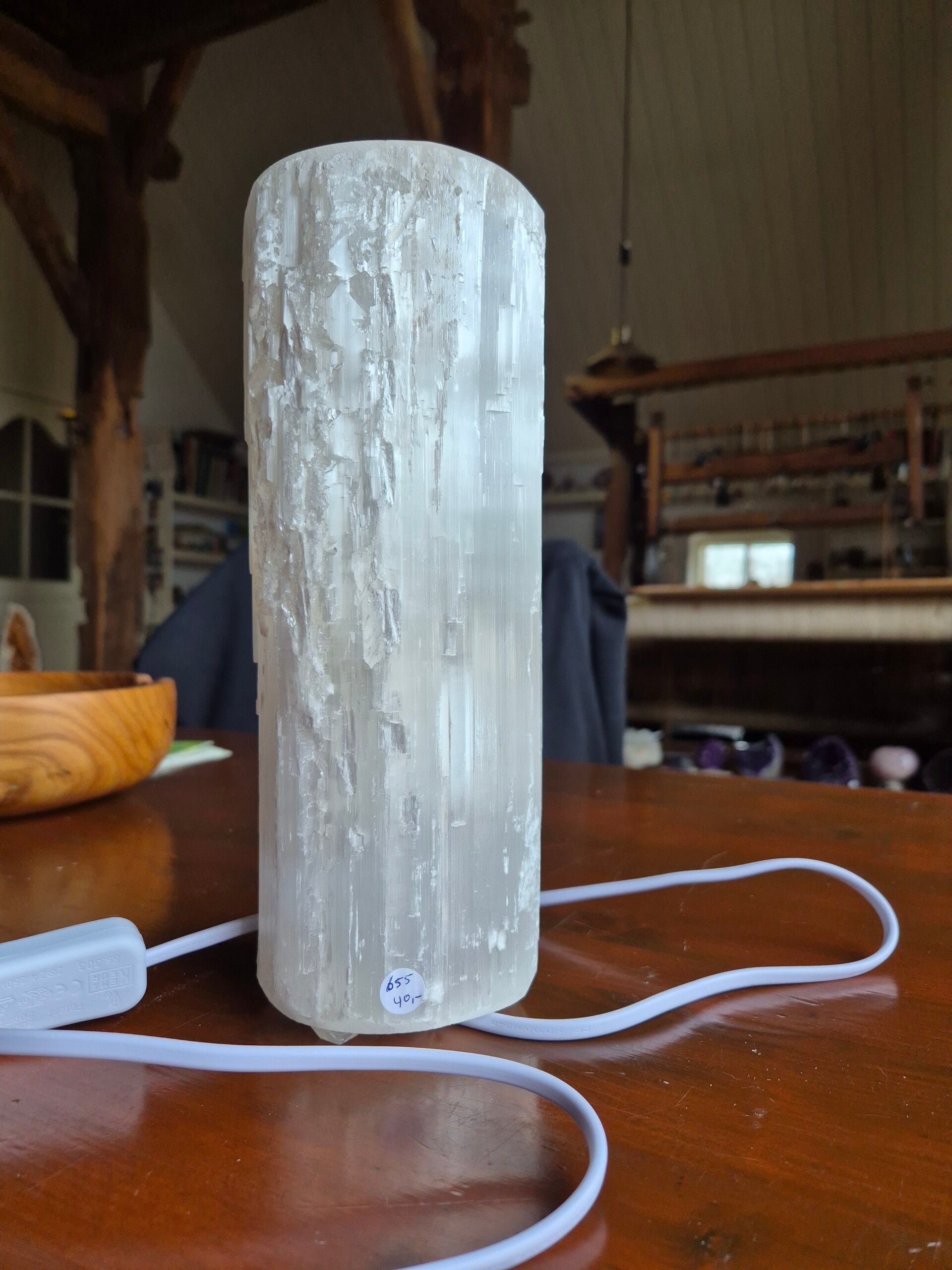 Lamp van Seleniet (satijnspaat spaat) cilinder model met E14 fitting, 15 W lamp en snoer met uit/aan knip mogelijkheid