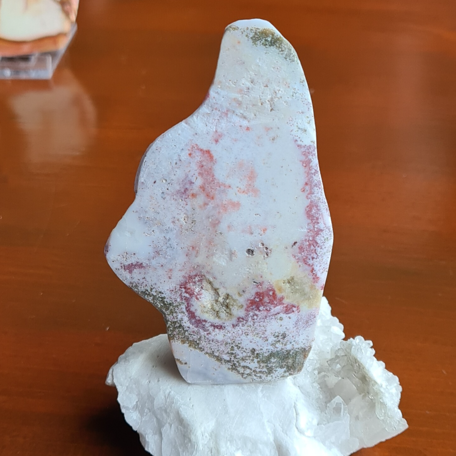Sculptuur van Polychroom Japis met kwarts met rechts enige kristalpunten.