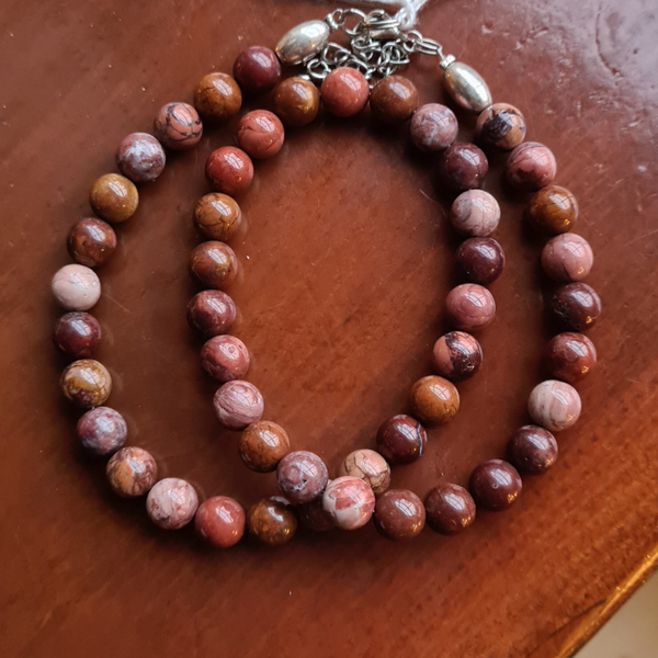 Ketting van 8 mm Kraal van Luipaard jaspis met zilveren tussen bal en slotje.